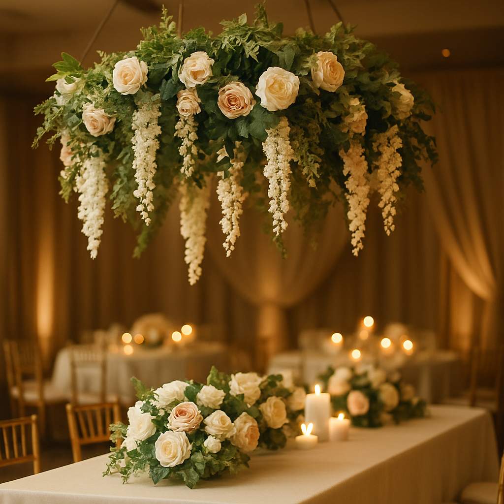 Custom floral canopy (wisteria, roses, greenery) to size and weight limits